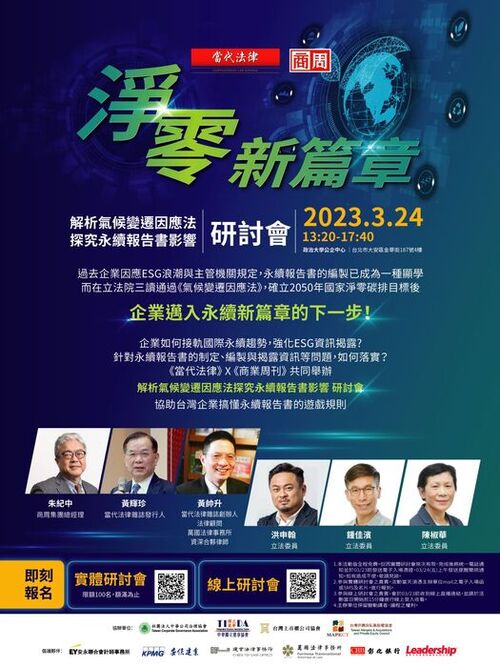 • 論壇主題|【淨零新篇章:解析氣候變遷因應法探究永續報告書影響】研討會